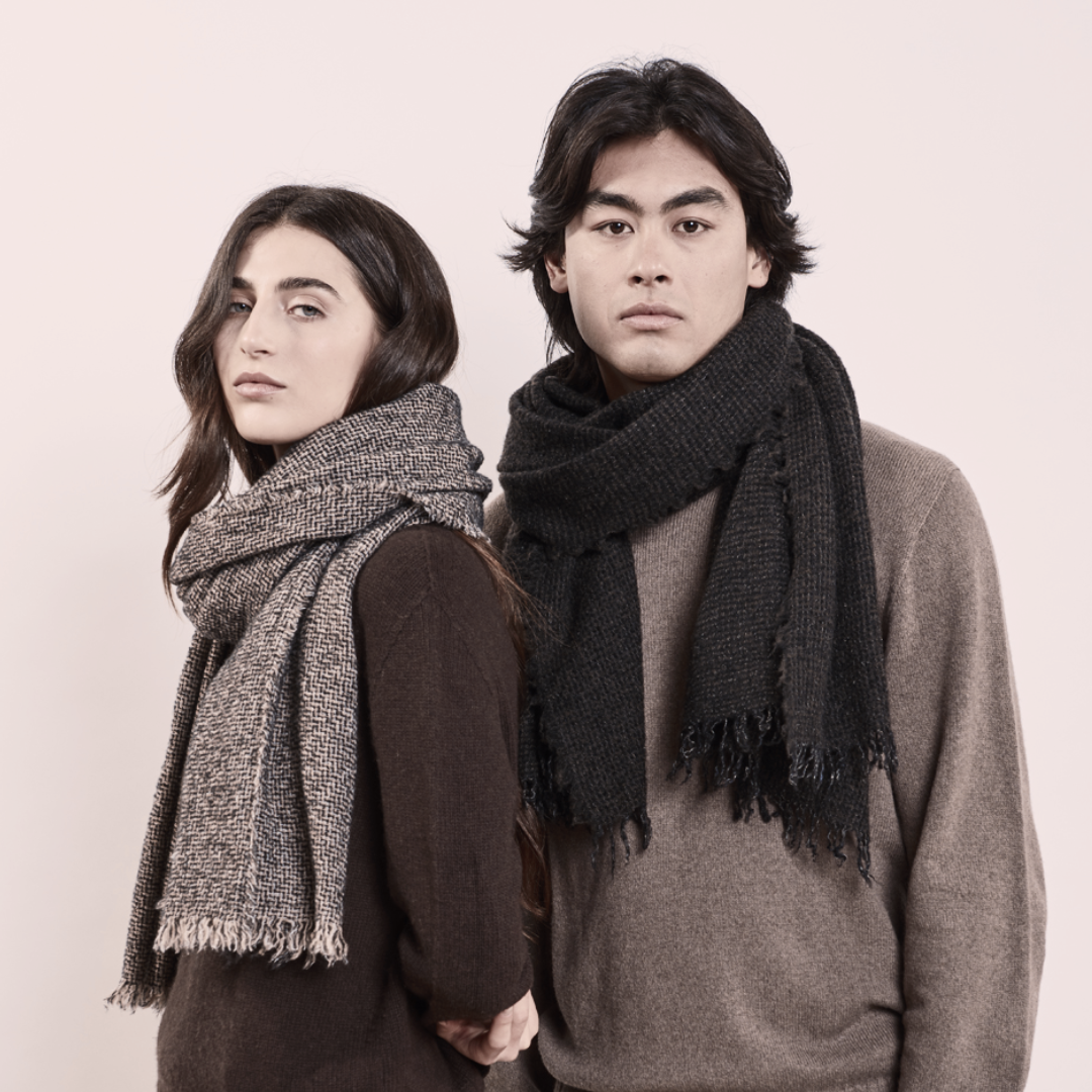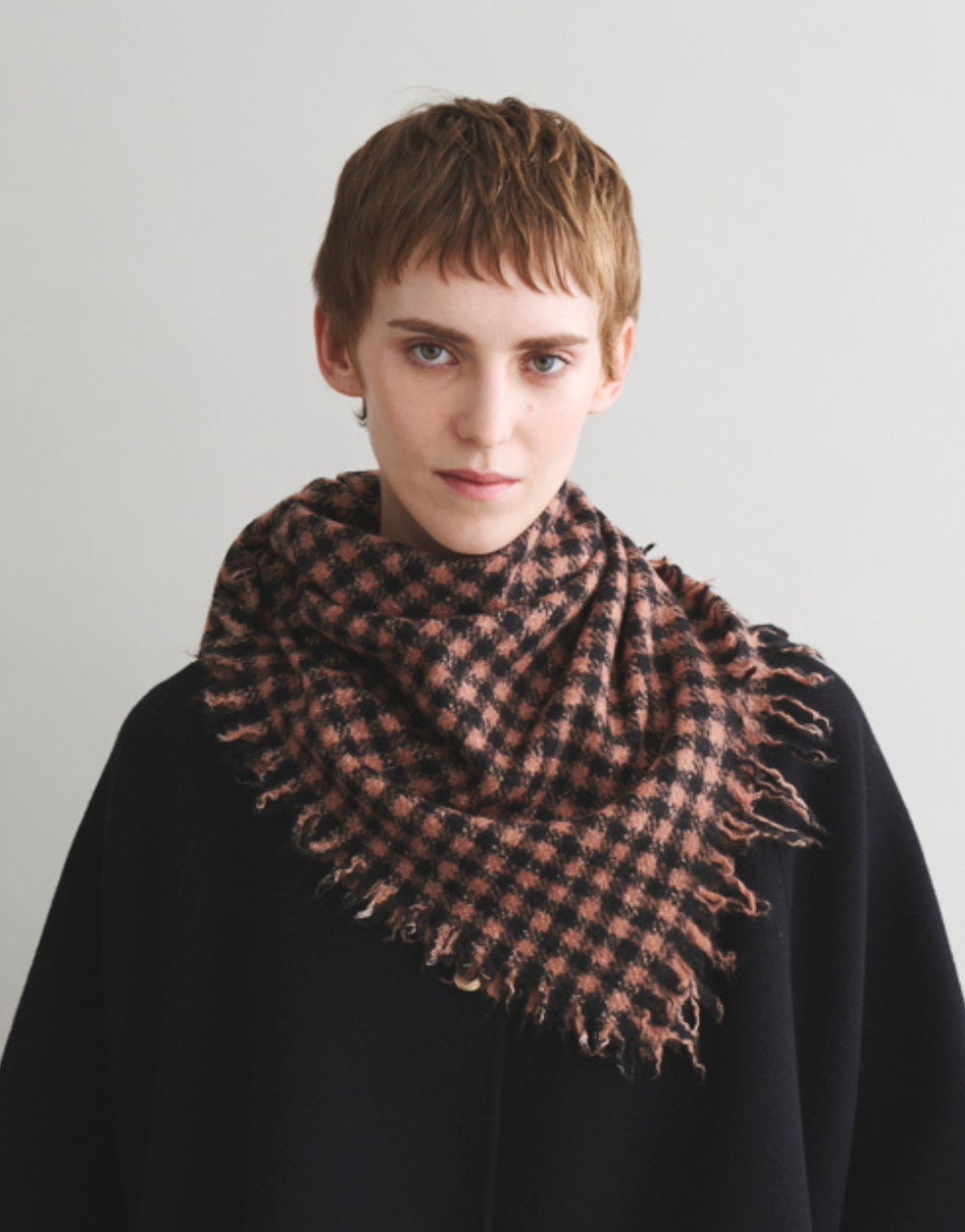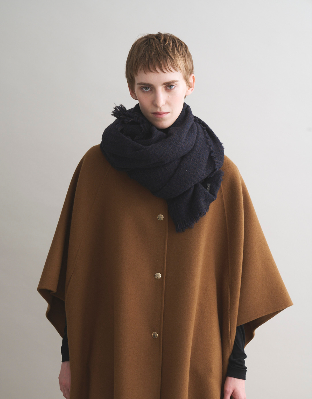 ダークトーンのネイビーに同じトーンのブラウン、ブラックを掛け合わせてガンクラブチェックに織り上げたストール。